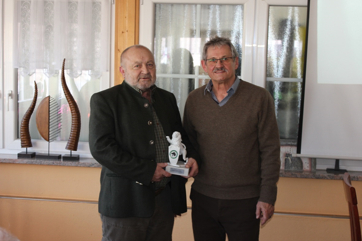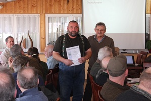 Rudi Fisch überreichte dann den Züchterpreis des Vereines für das Jahr 2023. Die Hunde aus dem Zwinger vom Perlbachtal (Zuchtgemeinschaft Mariana und Robert Meier) hatten im Jahr 2023 bei den Prüfungen, Zuchtschauen und Leistungszeichen am besten abgeschnitten.