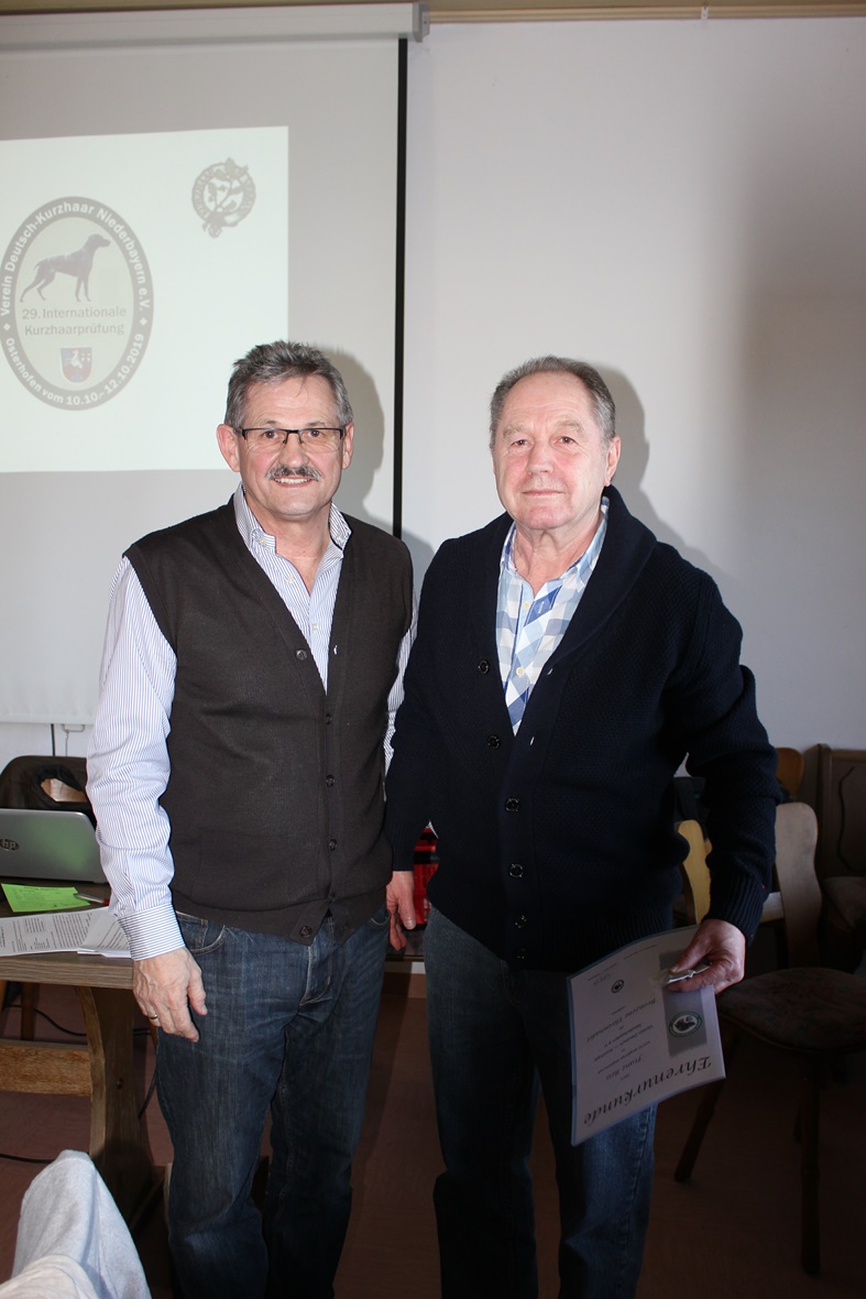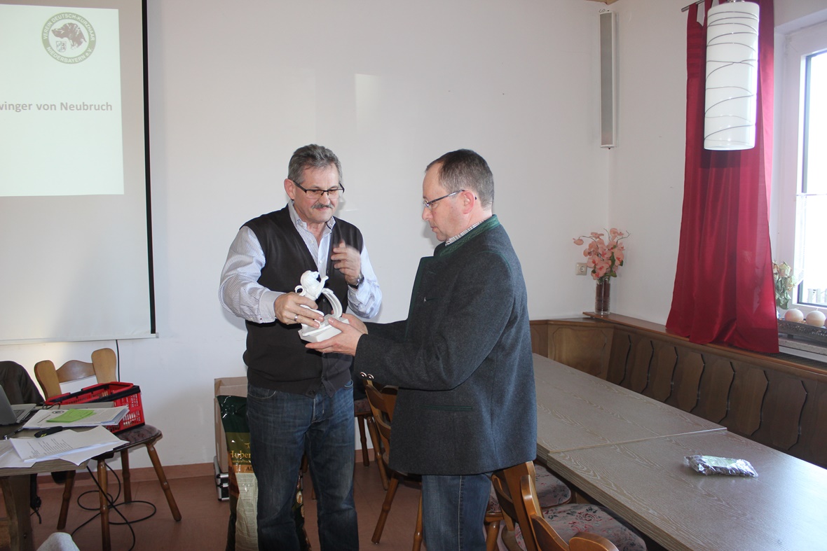 Sehr zahlreich waren die Mitglieder zur diesjährigen Jahreshauptversammlung erschienen. Die Jagdhornbläser unter Leitung von Siegi Liebl eröffneten die Versammlung. Der. 1. Vorsitzende konnte besonders die Ehrenmitglieder Fritz Blüml, Bernd Lackner und Alois Erndl begrüßen. Die Tätigkeitsberichte waren zur vollsten Zufriedenheit der anwesenden Mitglieder. Rudi Fisch konnte mit der Goldenen Ehrennadel den Präsidenten des JGHV Herrn Karl Walch, Günther Aumüller und die Ehefrau des langjährigen Vorsitzenden Marielle Bräu auszeichnen. Die Silberne Ehrennadel bekamen Karl Böggemann, Robert Schned und Karl - Franz Stacheter. Die Bronzene Ehrennadel erhielten Franz Reis, Martin Eiblmeier, Johann Pusl, Karl Roßmadl, Rudolf Mörtlbauer, Werner Wanger, Walter Lommer und Leonhard Zwicklbaur. Rudi Fisch ging vor allem auf die diesjährige IKP ein, die in den Revieren um Osterhofen stattfinden wird. Alois Erndl bedankte sich bei Schriftführerin Mirjam Matschiner für ihr Engagement mit einem Blumenstrauß. Den Züchterpokal konnte Hubert Huber mit seinem Zwinger "vom Neubruch" in Empfang nehmen. Den Abschluss bildete ein gemeinsames Essen. Man saß danach noch in gemütlicher Runde beisammen und besprach die anstehenden Veranstaltungen.